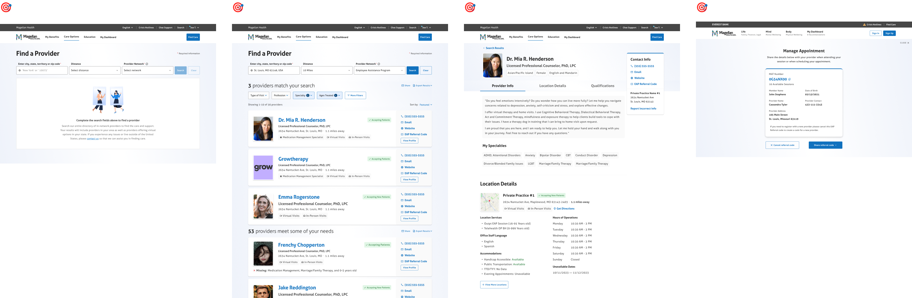 Our Search Tool went from having 10 screens to 3 screens, enabling us to focus on the core functionality for the search, results, and appointment experience. This reduced the front-end efforts needed by 70% for all accessibility, and consistent styling with our member portal.